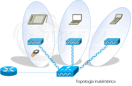 El último tipo de topología de red es una que no requiere el uso tradicional de conexiones de cable, como son las redes inalámbricasque usan las radiofrecuencias (RF) o infrarrojas (IR) son ondas que transmiten datos sobre una LAN. Para que los dispositivos puedan comunicarse con la red, es necesario que sean instaladas adaptadores (Wireless NIC). Las redes inalámbricas les dan a los diseñadores de red nuevas opciones, debido que no es necesario un medio físico para conectar las estaciones finales (lo que es excelente en las instalaciones de redes en edificios u oficinas cuyo espacio para cableado es inadecuado).