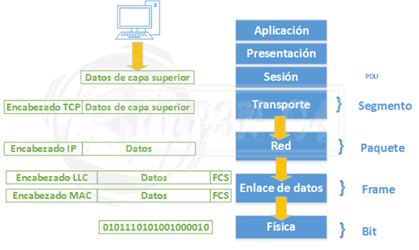 Cuando la capa de transporte recibe los datos de las capas superiores, esta adhiere un encabezado TCP (Transport Control Protocol) o un encabezado UDP (User Datagram Protocol y es llamado segmento. El segmento después pasa a la capa de red y le es añadido un encabezado IP por lo tanto y se convierte en paquete, el paquete pasa a la capa de enlace de datos y se convierte en frame, este frame después es convertido en bits y enviado a través del medio de red.
