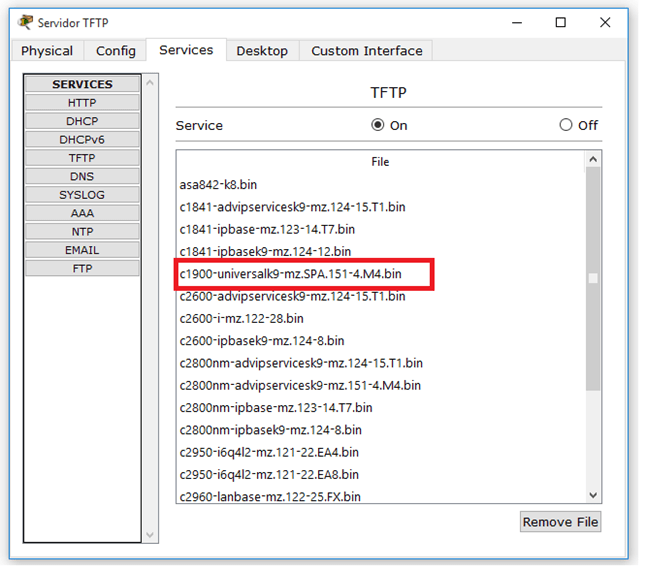 Ahora debemos verificar que en el servidor TFTP existe una imagen compatible con el router que tenemos, esto lo hacemos dando clic en el servidor TFTP > clic en la pestaña Servisios > finalmente en TFTP, vermos que existen varios IOS el que nosotros cargaremos será el c1900-universalk9-mz.SPA.151-4.M4.bin