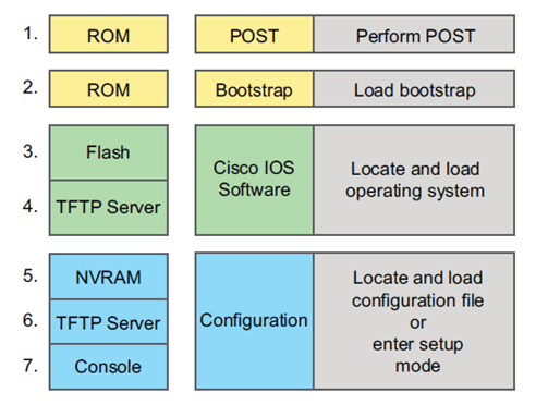 - Carga y corre el código bootstrap: es usado para determinar la ubicación del IOS de cisco y cargralo en la RAM y posteriormente correrlo.