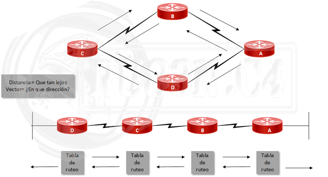 Vector distancia: los routers que usan un routeo basado en vector distancia comparten la información de la tabla de enrutamiento con todos los demás, este método de actualización es llamado “ruteo por rumor” en donde cada router recibe una actualización directamente de su vecino, en la imagen, el router B comparte información con router A y C. Router C comparte información de ruteo con router B y D. En este caso la información de ruteo en esta basado en métricas de vector distancia (número de saltos). Cada router incremente su métrica conforme va pasando por cada uno (incrementa el conteo de saltos). La acumulación de la distancia mantiene un seguimiento de la distancia de la ruta entre cualquiera de los dos puntos de la red, pero ¡! Los routers no conocen la topología exacta de la red. RIP es un ejemplo de protocolo Vector Distancia.