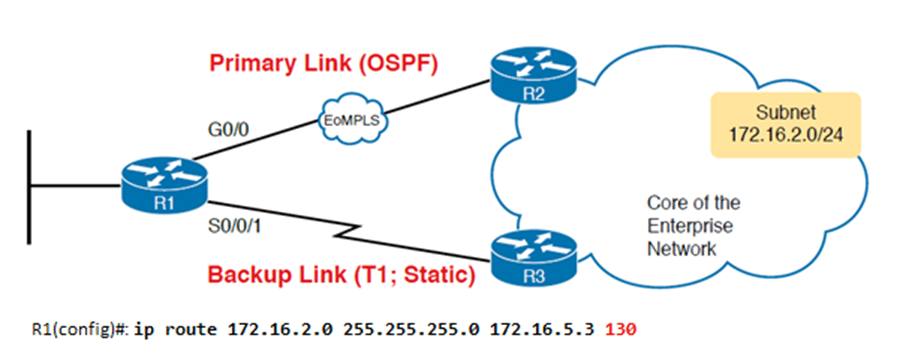Para ver cómo funciona, considere el ejemplo ilustrado en la Figura de abajo, que muestra un diseño diferente que el ejemplo anterior, esta vez con una sucursal con dos enlaces WAN: un enlace Gigabit Ethernet muy rápido y otro bastante lento (pero barato) T1. En este diseño, la red utiliza Open Shortest Path First Version 2 (OSPFv2) sobre el enlace principal, aprendiendo una ruta para la subred 172.16.2.0/24. R1 también define una ruta estática a través del enlace de respaldo a exactamente la misma subred, por lo que R1 debe elegir si usar la ruta estática o la ruta OSPFlearned.