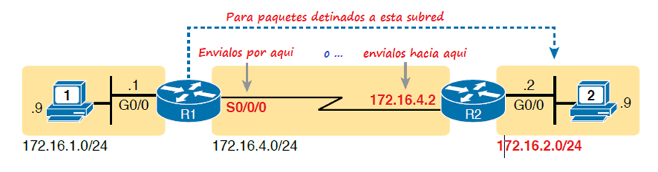 Como ejemplo de una ruta de red. La figura muestra solo los detalles relacionados con una ruta de red estática en R1, para la subred de destino 172.16.2.0/24, que se encuentra en el extremo derecho. Para crear esa ruta de red estática en R1, R1 configurará la ID y la máscara de subred, y la interfaz saliente de R1 (S0/0/0) o R2 como la IP del router del siguiente salto. dirección (172.16.4.2).