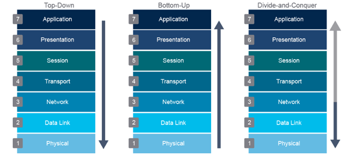 - De abajo hacia arriba: comience con la capa física OSI y avance.