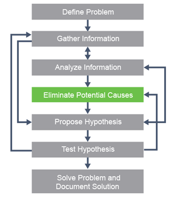 Por lo tanto, la respuesta inicial de un solucionador de problemas debería ser (Paso 2) recopilar más información y utilizarla para (Paso 3) eliminar posibilidades. Determine los síntomas hablando con el usuario, observando personalmente o consultando sistemas de gestión como NetFlow, Syslog y monitores SNMP. La eliminación de posibilidades depende de la experiencia y de la comprensión de la tecnología y la topología.