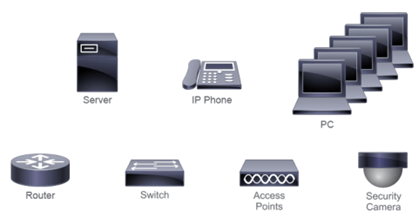 - Hosts (Puntos finales): Dispositivos que envían o reciben datos, incluyendo laptops, servidores de archivos, cámaras de seguridad y sensores ambientales.