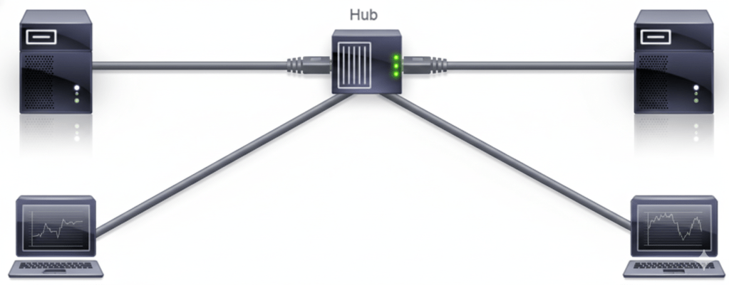 En los inicios de las redes se utilizaba el hub, un dispositivo de Capa 1 que funcionaba como un simple repetidor eléctrico. El hub compartía el mismo medio entre todos los usuarios, creando un «dominio de colisión». Si dos dispositivos transmitían simultáneamente, los datos chocaban, obligando a retransmitir y reduciendo drásticamente la eficiencia.