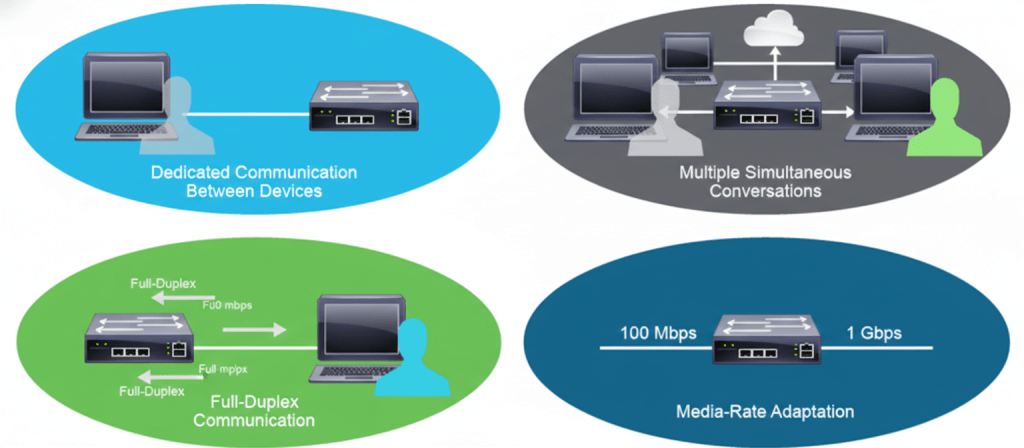 El switch eliminó este problema mediante la segmentación. Cada puerto del switch crea un dominio libre de colisiones, permitiendo una comunicación privada y fluida. Gracias a esta microsegmentación, cada usuario siente que tiene «toda la carretera para él solo», eliminando las esperas innecesarias de las arquitecturas antiguas.