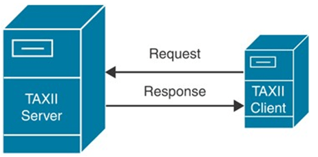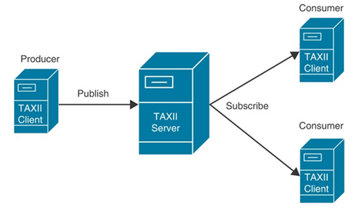 El intercambio automatizado confiable de información de indicadores (TAXII, por sus siglas en ingles) es un protocolo de aplicación para intercambiar información sobre amenazas cibernéticas (CTI) a través de HTTPS. Define dos servicios primarios, Colecciones y Canales. La figura de abajo abajo muestra el servicio de recogida. Una colección es una interfaz para un depósito lógico de objetos CTI proporcionados por un servidor TAXII que permite a un productor alojar un conjunto de datos CTI que pueden solicitar los consumidores: los clientes y servidores TAXII intercambian información en un modelo de solicitud-respuesta.