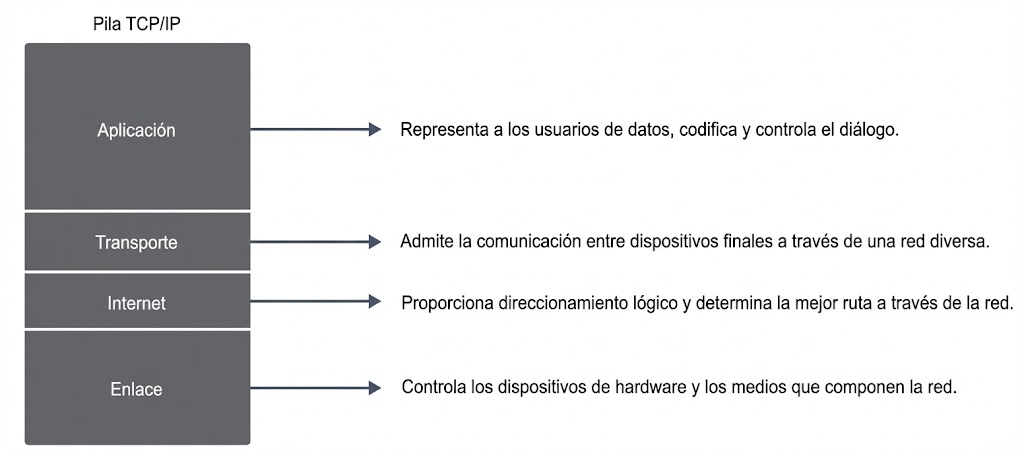 El modelo TCP/IP, a veces llamado «pila IP», es el conjunto de protocolos que se utiliza activamente en las redes modernas, incluyendo internet. Es más simple que el modelo OSI y consta de cuatro capas.