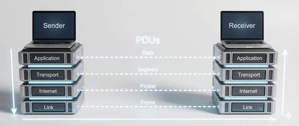 Cuando un usuario envía datos (como un correo electrónico), estos descienden por las capas del modelo TCP/IP en el dispositivo emisor. A medida que los datos pasan por la pila, cada capa añade su propia información de control. En la mayoría de las capas, se añade un encabezado; en la capa de Enlace, se añade tanto un encabezado como un tráiler. Este proceso no solo añade información, sino que también cambia el nombre de la Unidad de Datos de Protocolo (PDU), el término genérico para el bloque de datos en cualquier capa.