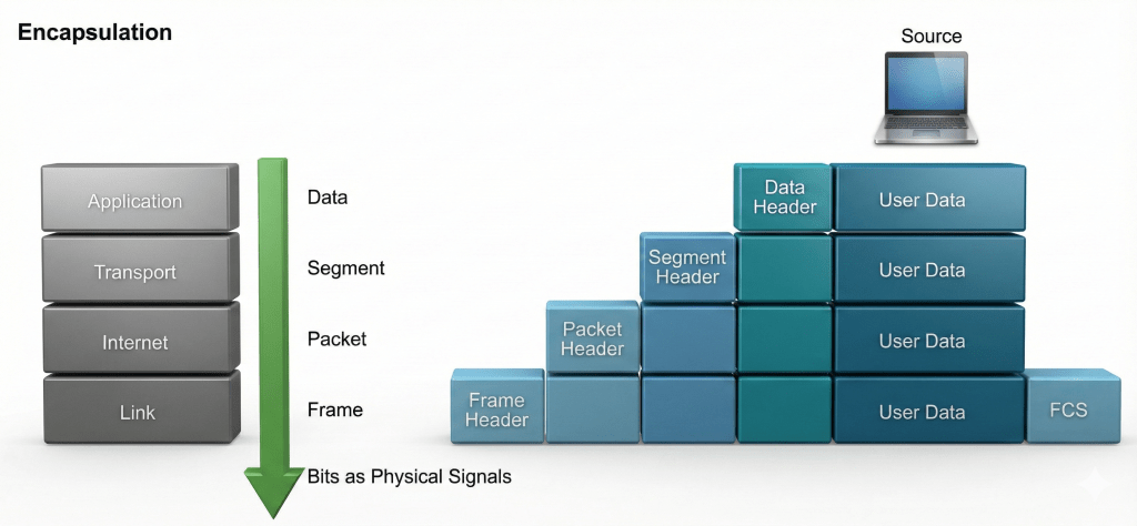 Para que los datos de una aplicación viajen por la red, deben pasar por un proceso llamado encapsulación. La mejor analogía es la de un regalo que se coloca dentro de una caja, que a su vez se mete en una caja más grande, y así sucesivamente.